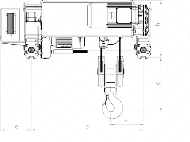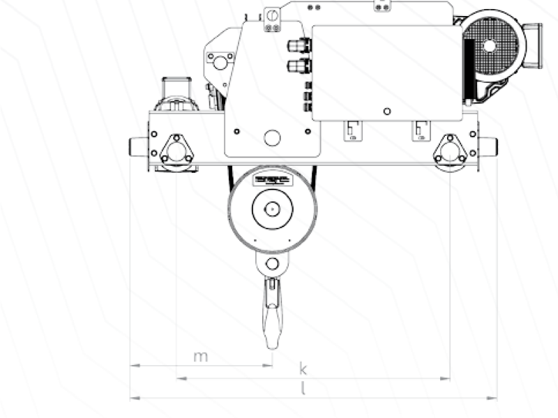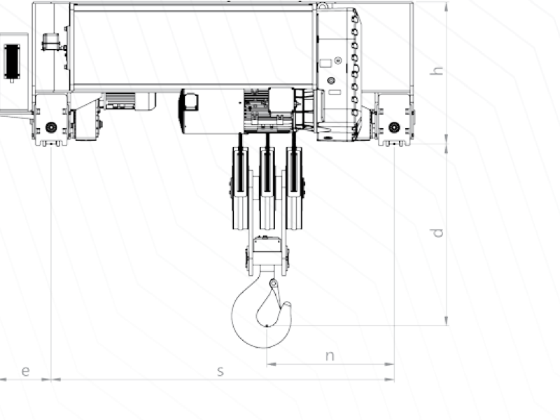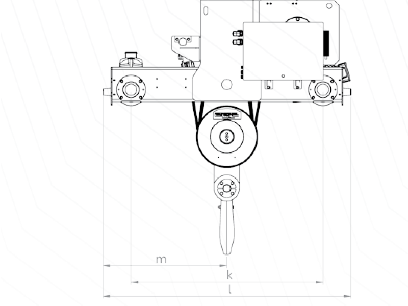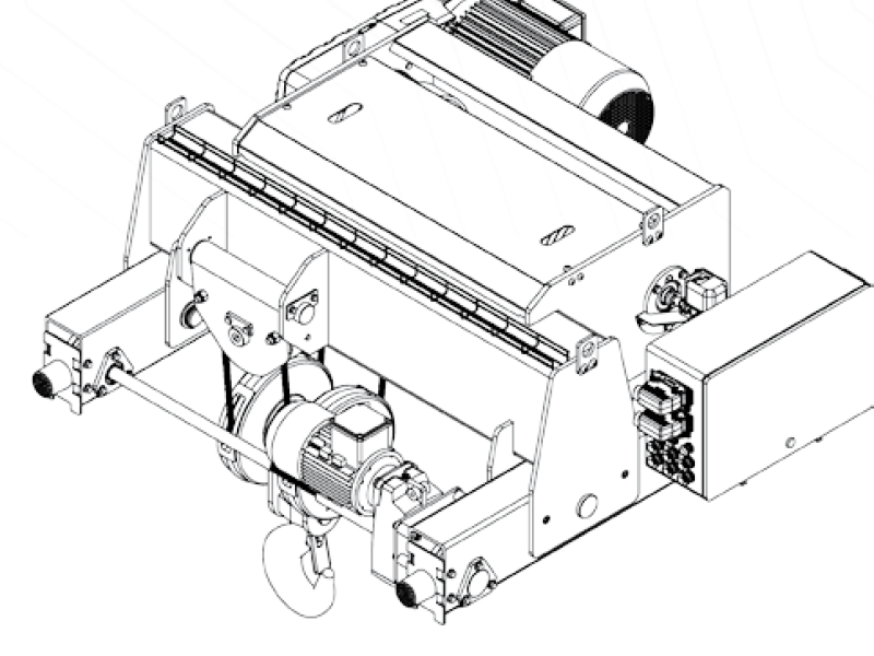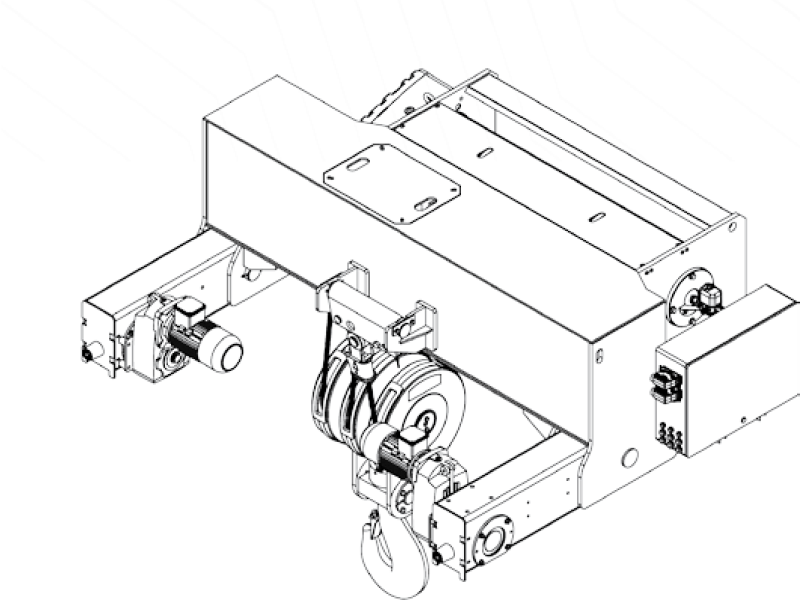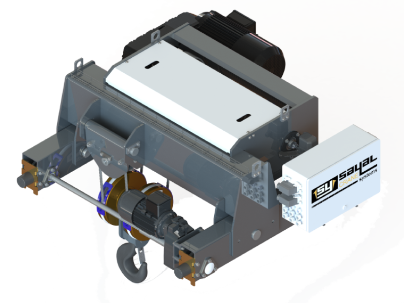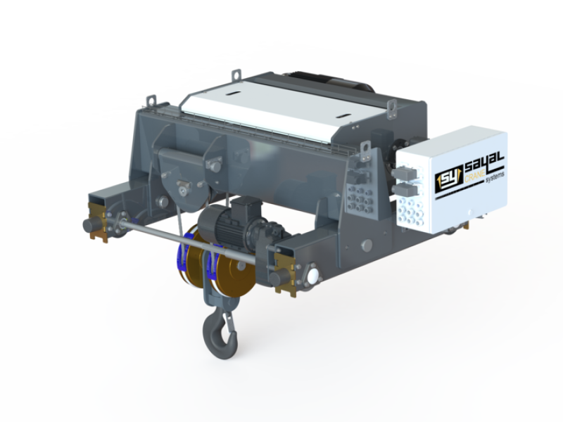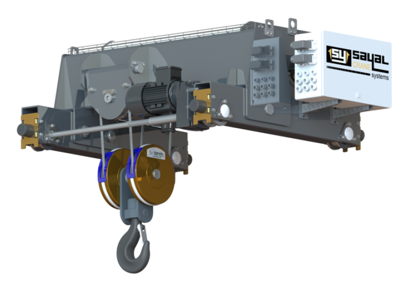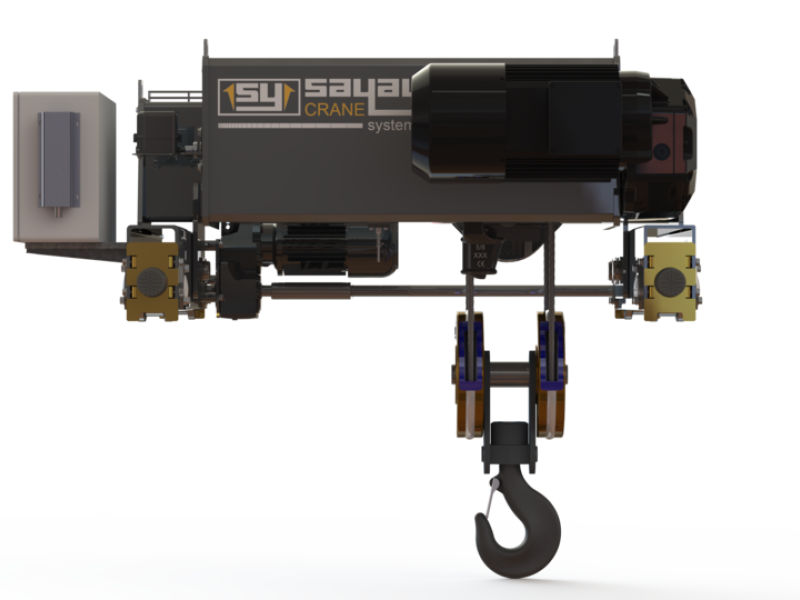 The system is specially designed for long-term operation with a plastic rope guide that minimizes the risk of injury to personnel in case of rope guide part breakage. It features trolley wheels made from EN-GJS-700 quality cast material and articulated body-trolley connections. Additionally, it is equipped with dual-stage limit switches for precise control of crane movements. The control unit, with a 24VDC emergency stop button, includes short circuit protection, phase protection relay, thermal magnetic protection against overcurrent, and motor overheating, enhancing safety. Optional load indicators and hooks with finger protection, compliant with DIN standards, ensure safety and ease of use